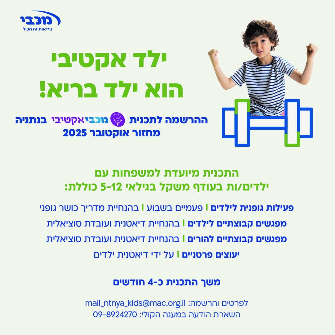 שנה חדשה בפתח וזה הזמן לעשות שינוי למען ילדינו ולמען המשפחה כולה. ההרשמה לתוכנית מכבי אקטיבי בנתניה אוקטובר 2025 בעיצומה.